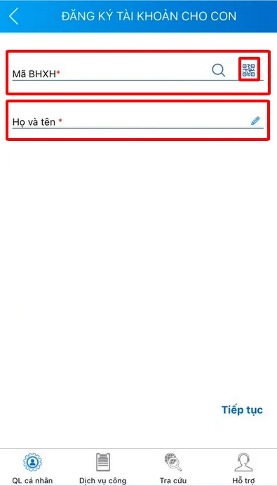 Bước 4: Nhập mã BHXH, Họ và tên của con, sau đó, nhấn “Tiếp tục”.