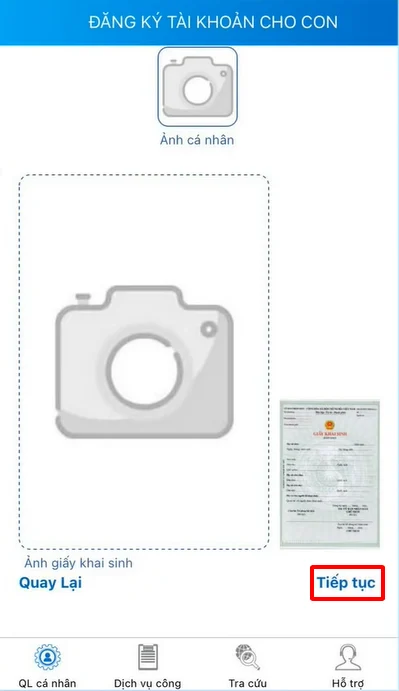 Bước 5: Cập nhật ảnh chân dung và ảnh giấy khai sinh cho con.